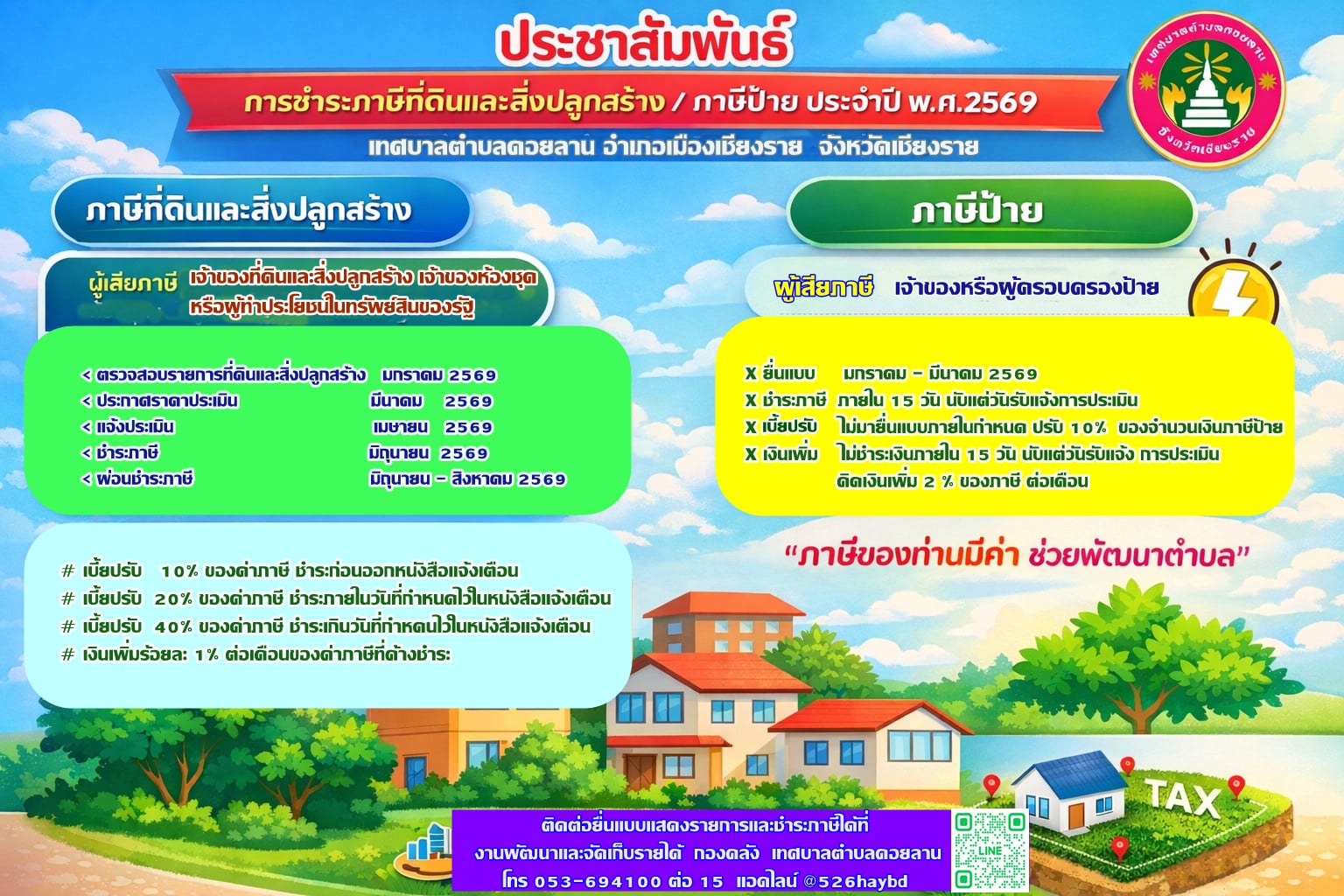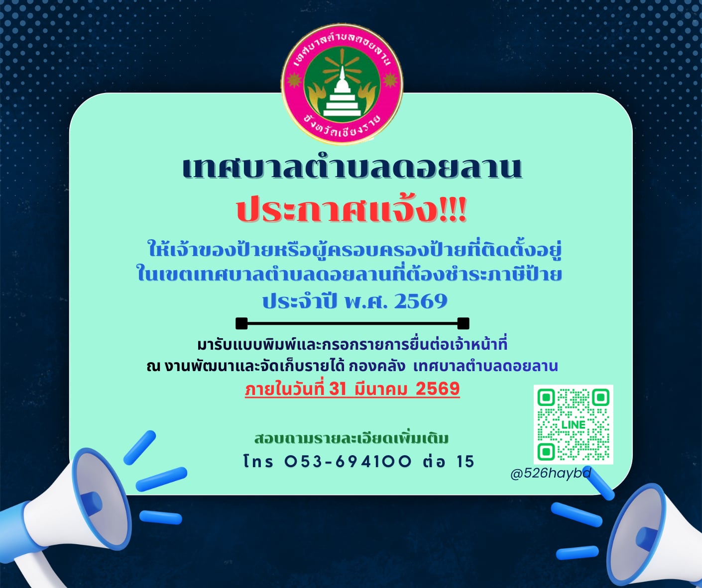 | 6 | (ประกาศรายชื่อผู้ชนะการเสนอราคา / ประกาศผู้ได้รับการคัดเลือก) จ้างโครงการก่อสร้างถนน คสล.ซอยข้างอาคารอเนกประสงค์ประจำหมู่บ้าน บ้านโป่งเกลือใต้ หมู่ที่ ๑๘ ตำบลดอยลาน อำเภอเมืองเชียงราย จังหวัดเชียงราย โดยวิธีเฉพาะเจาะจง | คลิกอ่าน.. | 28/1/2569 |