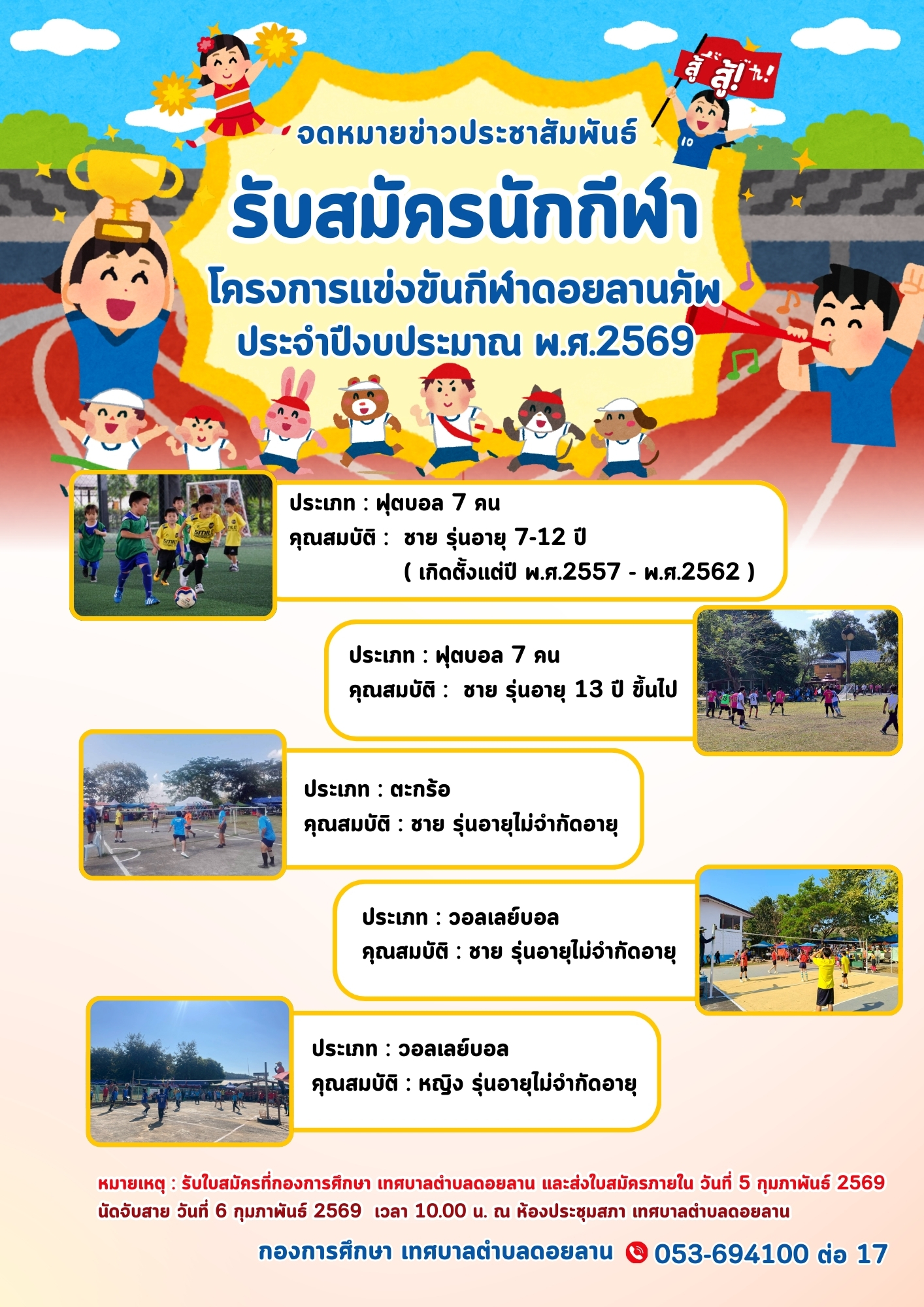 | 4 | (ประกาศรายชื่อผู้ชนะการเสนอราคา / ประกาศผู้ได้รับการคัดเลือก) จ้างเหมาจัดเตรียมสถานที่พร้อมสนามการแข่งขัน และทำความสะอาดบริเวณงานหลังเสร็จงาน ตามโครงการแข่งขันกีฬาสีเชื่อมความสัมพันธ์ตำบลดอยลาน ประจำปีงบประมาณ พ.ศ. ๒๕๖๙ โซน ๖ โป่งช้างเกมส์ วันที่ ๓๑ เดือนมกราคม - วันที่ ๑ เดือนกุมภาพันธ์ พ.ศ. ๒๕๖๙ ณ สนามกีฬาโรงเรียนบ้านโป่งช้าง หมู่ ๑๕ บ้านโป่งช้างเหนือ ตำบลดอยลาน อำเภอเมืองเชียงราย โดยวิธีเฉพาะเจาะจง | คลิกอ่าน.. | 29/1/2569 |