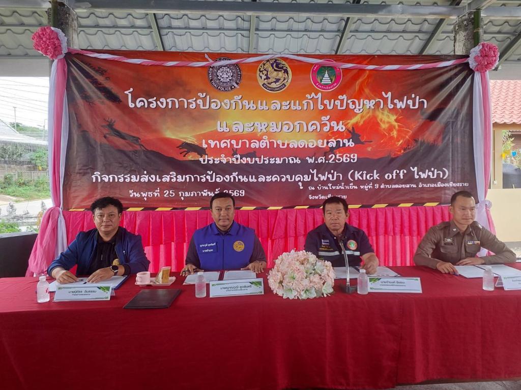 วันที่ 25 กุมภาพันธ์ 2569 เวลา 09.00 น. งานป้องกันและบรรเทาสาธารณภัย เทศบาลตำบลดอยลาน ดำเนินโคงการป้องกันและแก้ไขปัญหาไฟป่าและหมอกควัน ประจำปีงบประมาณ พ.ศ.2569 ขึ้น โดยมีนายญาณวุฒิ สุดพิมศรี นายอำเภอเมืองเชียงราย เป็นประธาน kick off ป้องกันไฟป่าหมอกควัน ร่วมกับ กำนัน ผู้ใหญ่บ้าน และผู้ช่วยผู้ใหญ่บ้าน ชุด ชรบ. และชุดอาสาป้องกันและดับไฟป่า ณ บ้านใหม่น้ำเย็น หมู่ที่ 9 ตำบลดอยลาน อำเภอเมืองเชียงราย