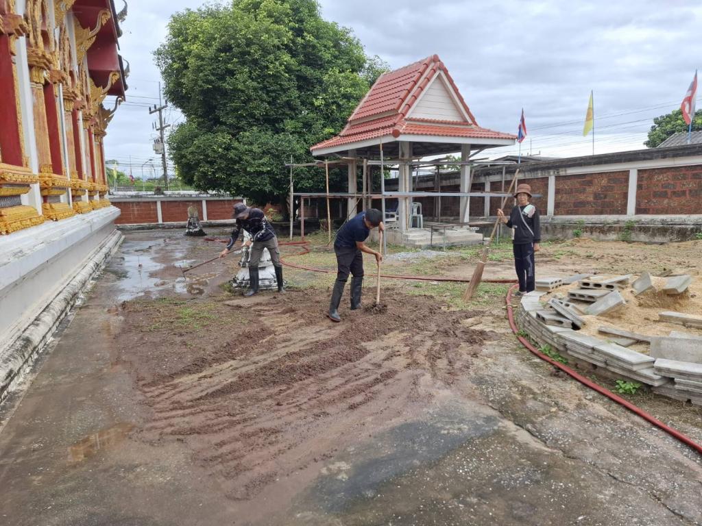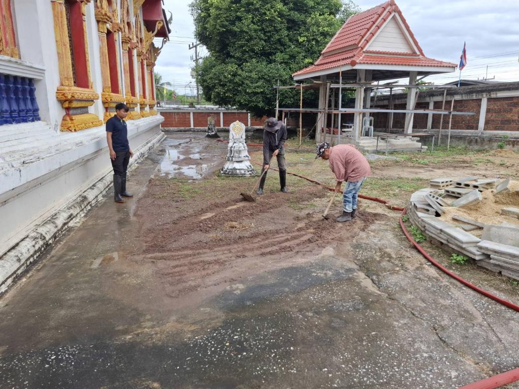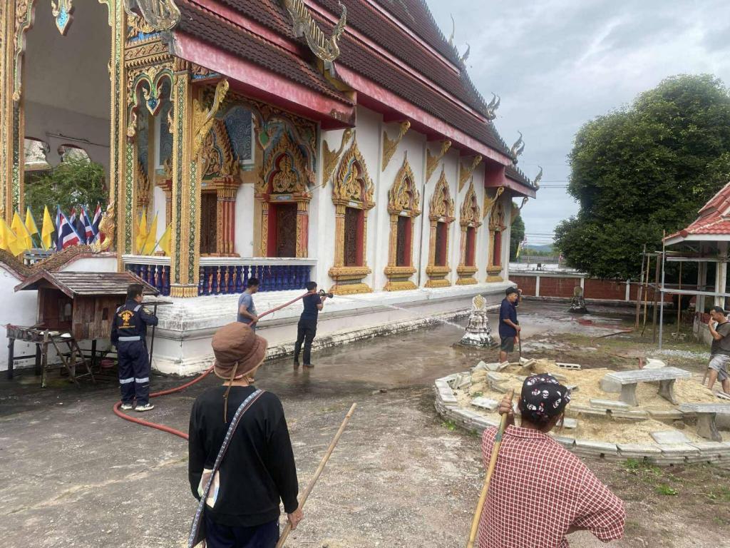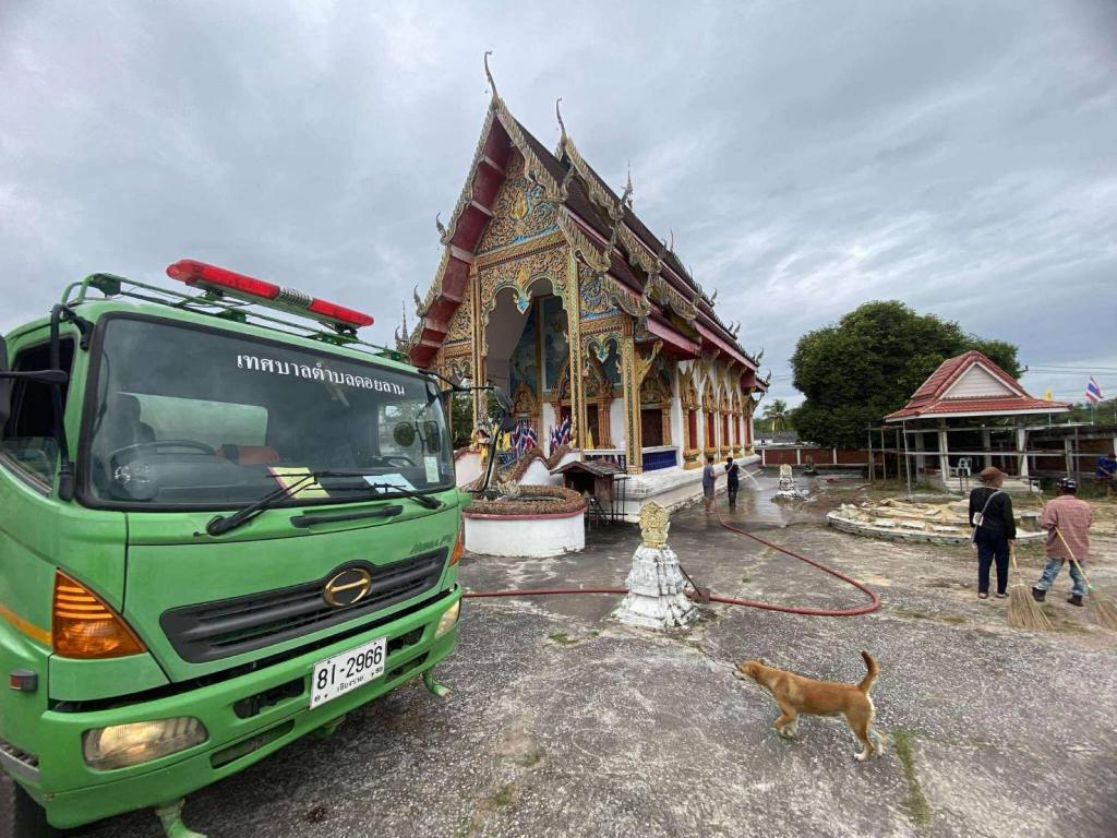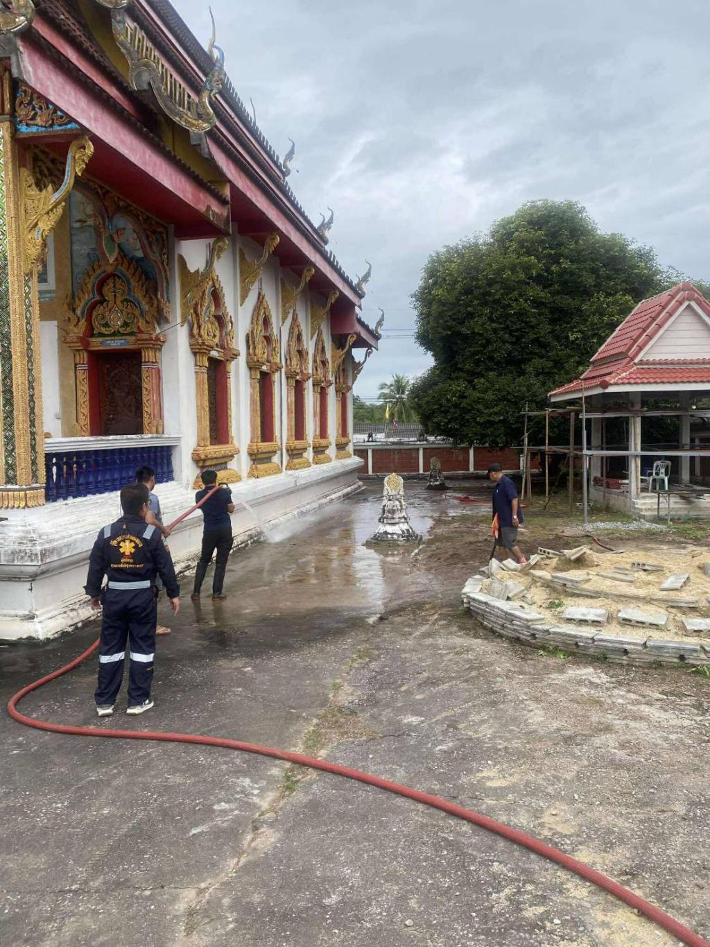 งานป้องกันและบรรเทาสาธารณภัยนำรถบรรทุกน้ำอเนกประสงค์พร้อมเจ้าหน้าที่ประจำรถออกปฏิบัติงานฉีดน้ำทำความสะอาดบริเวณลานวัดรอบพระอุโบสถวัดดอนเรือง หมู่ที่ 4 ตำบลดอยลาน เพื่อเตรียมความพร้อมการจัดงานบุญกฐินประจำปี ตามที่ได้รับการร้องขอจากกำนันตำบลดอยลาน